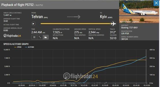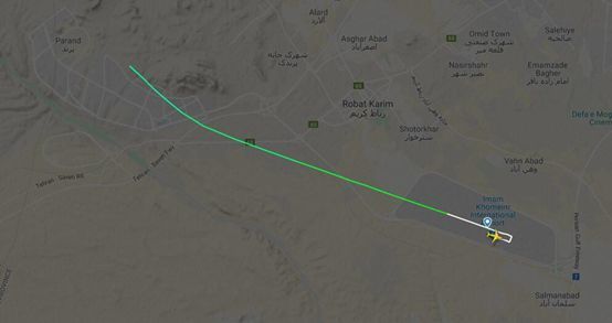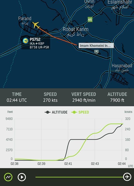 首先我們看這架飛機的情況,這架飛機航班號PS752,執行伊朗首都德黑蘭到烏克蘭首都基輔的飛行,飛行途中將經過土耳其臨空,飛機從德黑蘭機場起飛時間為02:42UTC(國際時間,伊朗當地時間是05:42,接近清晨,但是看不到陽光),僅僅2分鐘后飛機墜毀,證據是飛機信息廣播系統ADS-B在02:44UTC停止工作。