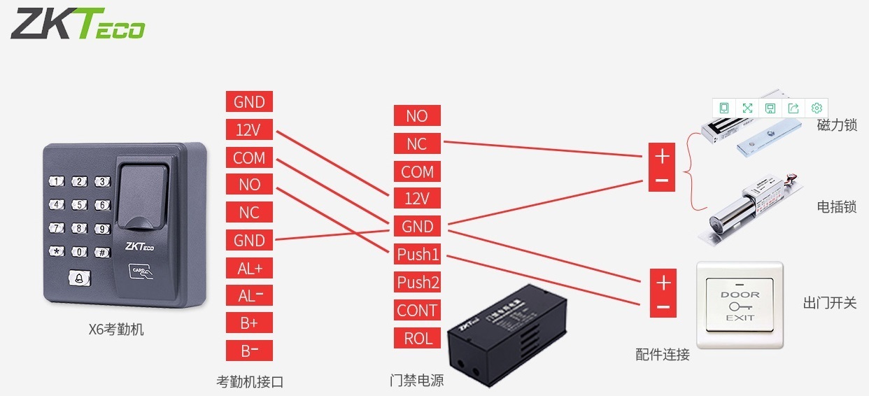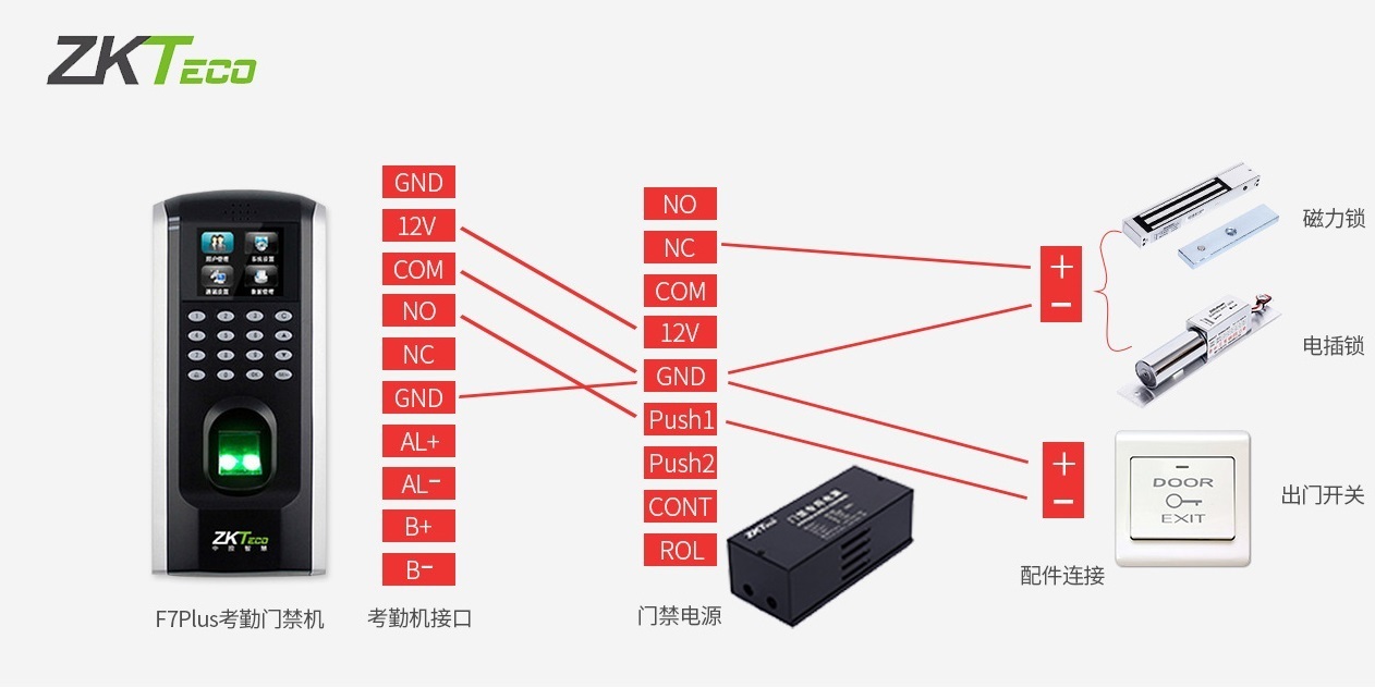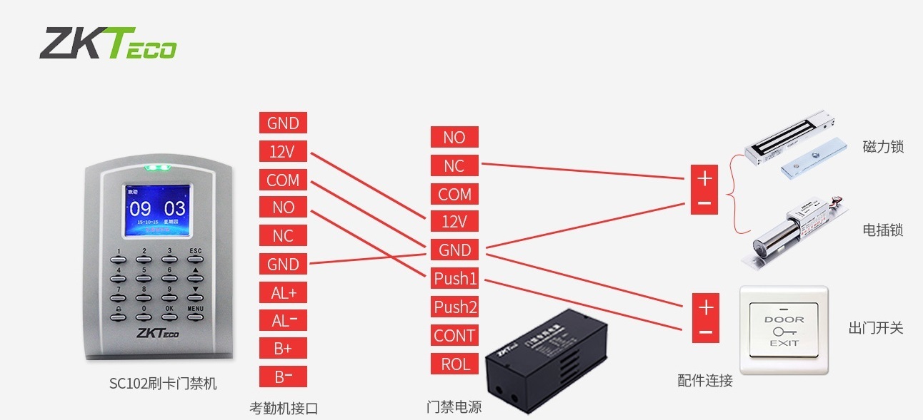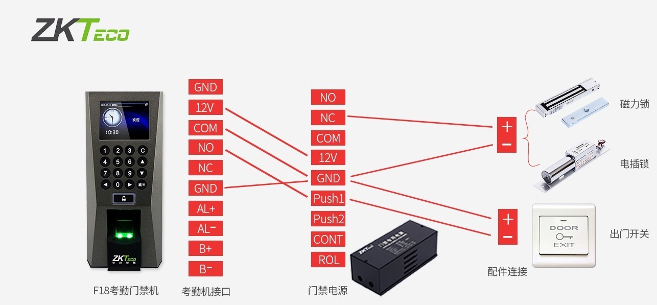 大型聯(lián)網(wǎng)門禁系統(tǒng)接線方法:門禁考勤一體機(jī):GND:接地(接門禁電源的GND);12V:接電源門禁電源的12V,為門禁主機(jī)提供12V的電壓;COM:公共端;NO:通電上鎖(接門禁電源的PUSH);NC:斷電開鎖,AL+:警報(bào)器正極;AL-:警報(bào)器負(fù)極;BUT:按鈕;B+:門鈴正極;B-:門鈴負(fù)極。